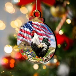 Set Of 2 Rooster American Flag Wooden Christmas Ornaments 5.5″