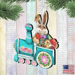 Set Of 2 Easter Bunny Train Ride In A Village Wooden Christmas Ornaments 5.5″