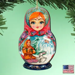 Set Of 2 Matreshka Doll Santa Bunny Wooden Christmas Ornaments 5.5″