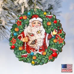 Set Of 2 Santa With Birds Wreath Wooden Christmas Ornaments 5.5″