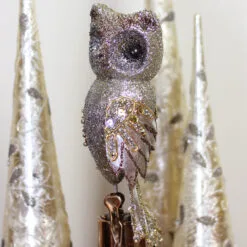 This light-catching, glittered and sequined owl ornament features shades of gold with warm undertones