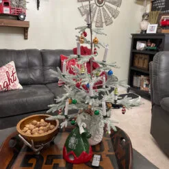 Features mini tree topper, garland and different shaped ornaments (bulbs, Santa Claus, nutcracker, Christmas tree, snowman, train, candy, and polar bear)
