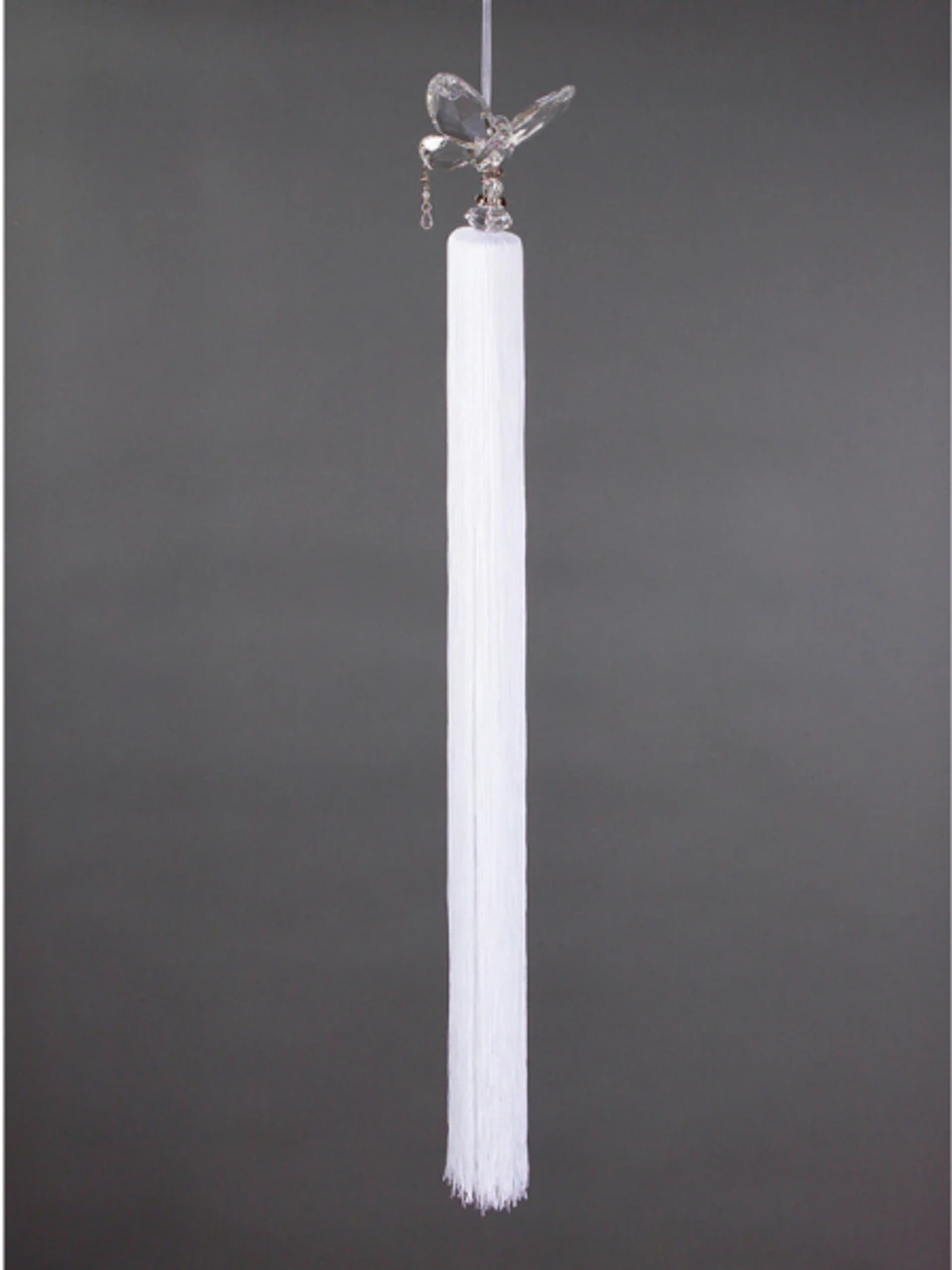 Clear butterfly is embellished with a dramatic decorative dangling tassel