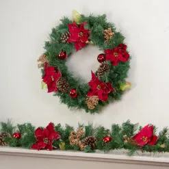 Features red and gold velvet poinsettias and shiny red ball ornaments