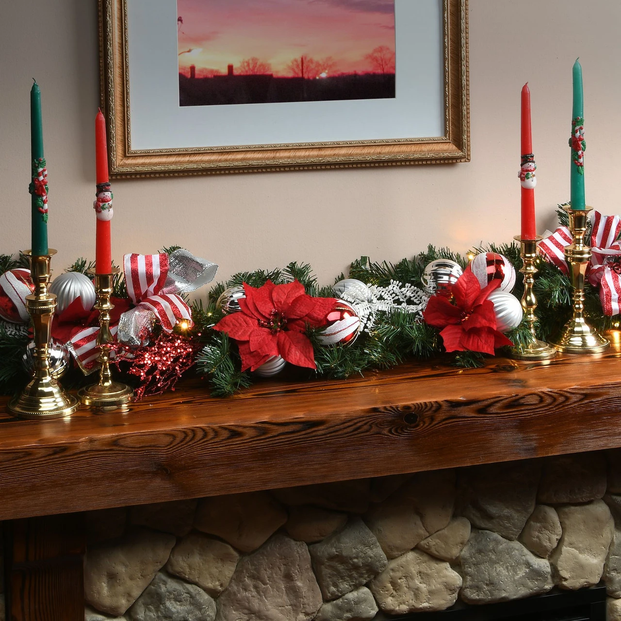 Trimmed with red berries, ball ornaments, and bright red and white ribbon