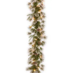 Features mixed tip garland sprinkled with snow and trimmed with pine cones
