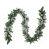 Features snow-dusted tips and is trimmed with red berries and pine cones