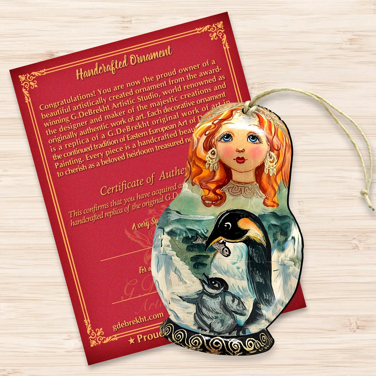 Ornaments depict a Matreshka doll with a penguin in the coastal area