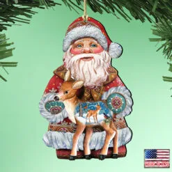 Ornaments depict Santa Claus holding a fawn with birds and another fawn image on it