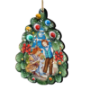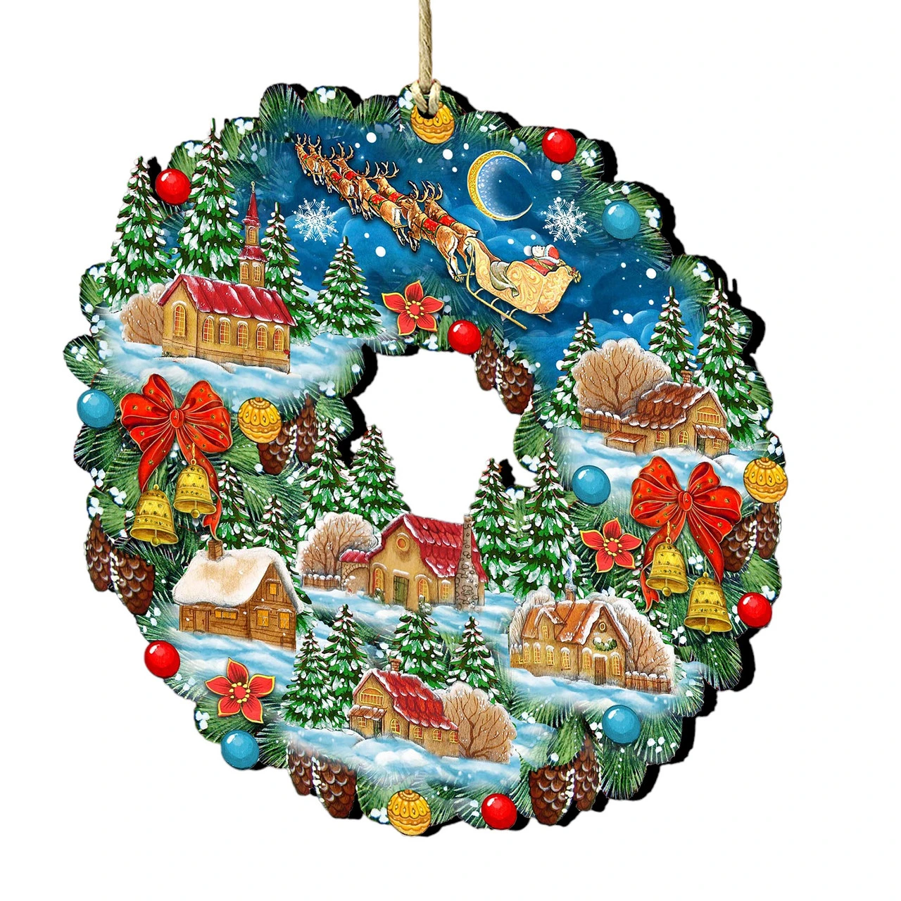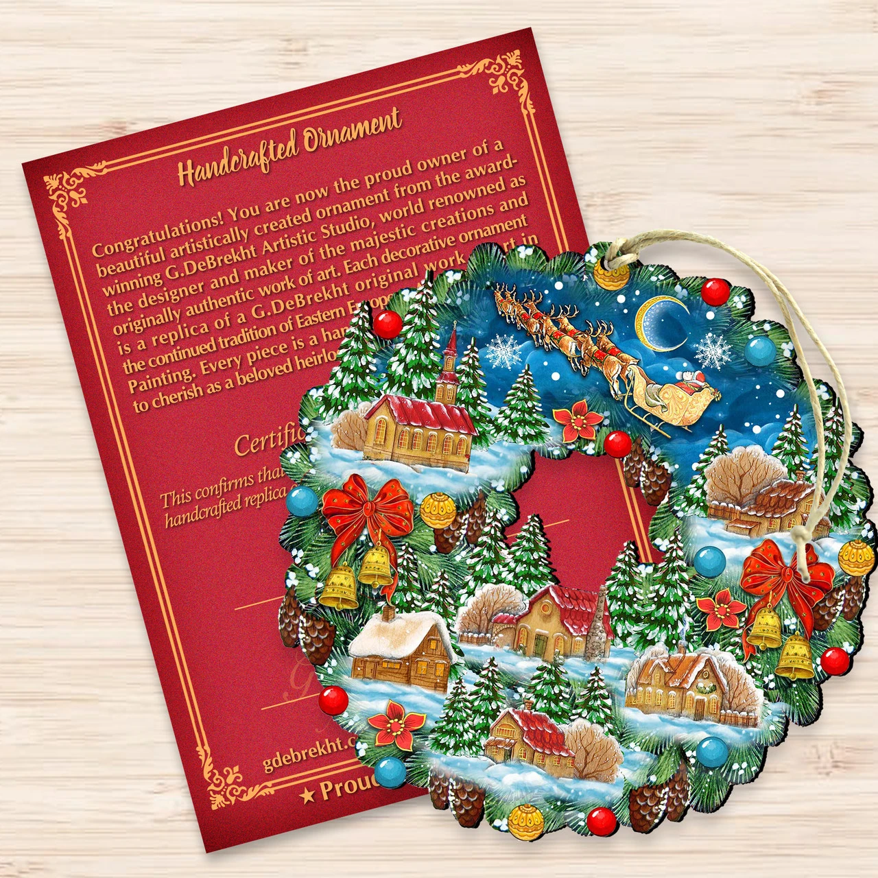 Ornaments depict Santa Claus riding his sleigh pulled by his reindeer around the world