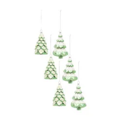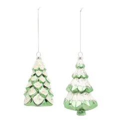 Ornaments adorned with a classic pine tree motif and shining green finish with a “snowy” accent